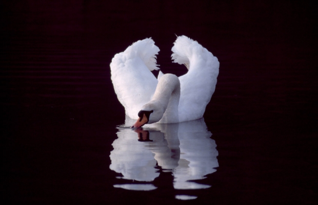 Demonstrando agressividade para proteger seu território, um cisne se coloca em clássica posição de ataque. A imagem refletida na água negra aumenta o impacto da cena (Foto: Becky L. Chadd/Wild Planet).