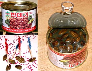 Larva de bicho da seda é um lanche popular na Coréia. Pode ser adquirido pela internet