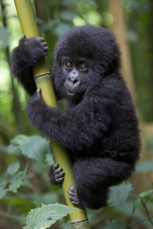 No Parque Nacional dos Vulcões, em Ruanda, um gorila de dez anos brinca com um bambu enquanto sua mãe caminha pela selva (Foto: Suzi Eszterhas/Wild Planet).